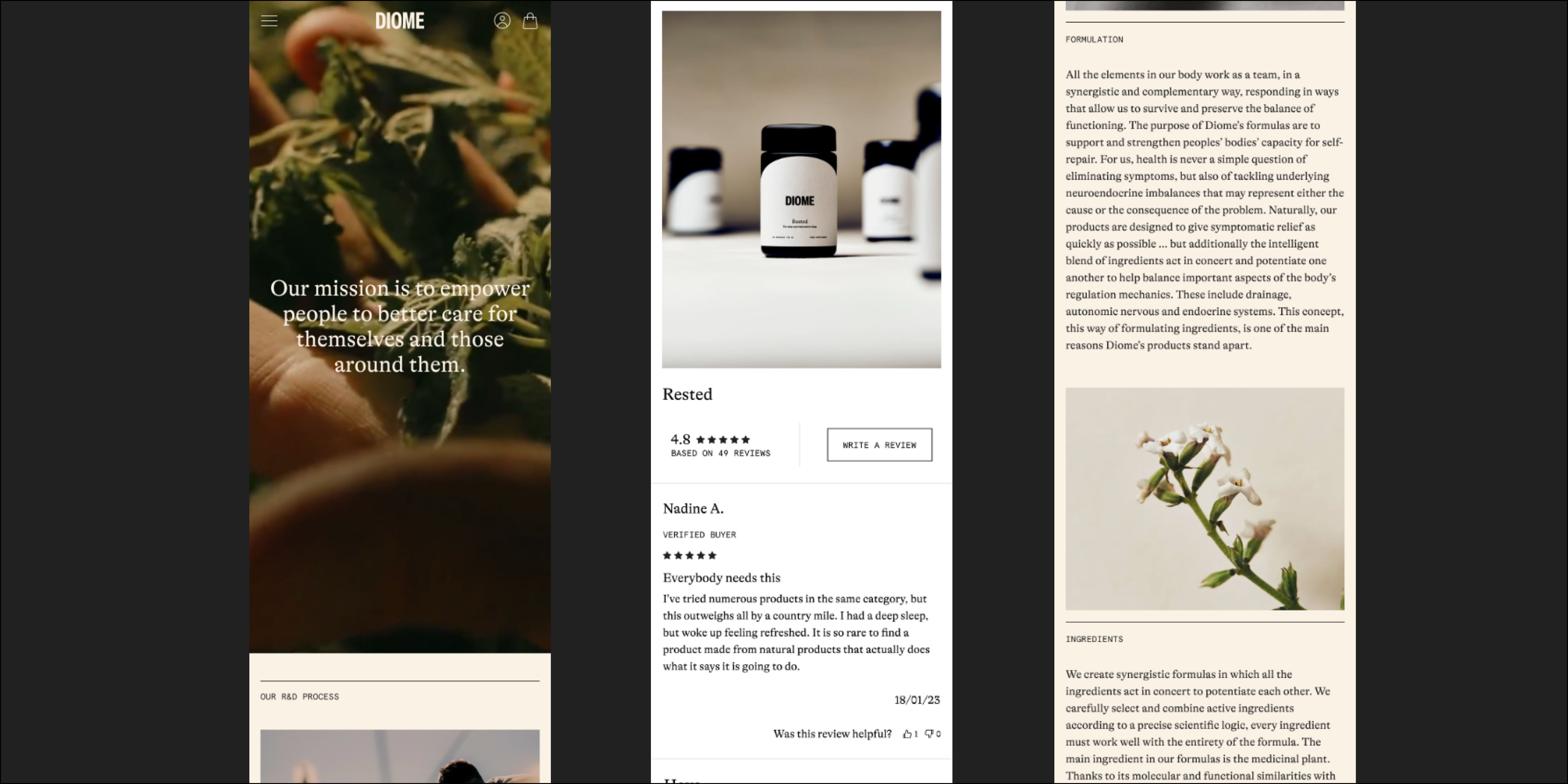 Diome, a burgeoning natural medicine brand, approached Bean with a brand kit and an exciting debut product poised to disrupt the wellness market. Leveraging our expertise in e-commerce development, we worked with Diome and their design team to launch a bespoke Shopify website. Through careful attention to detail and a deep understanding of Diome's unique value proposition, we ensured that every aspect of the website resonated with their brand identity and ethos. Our goal was to create a digital storefront that not only showcased Diome's products but also fostered meaningful connections with their audience.